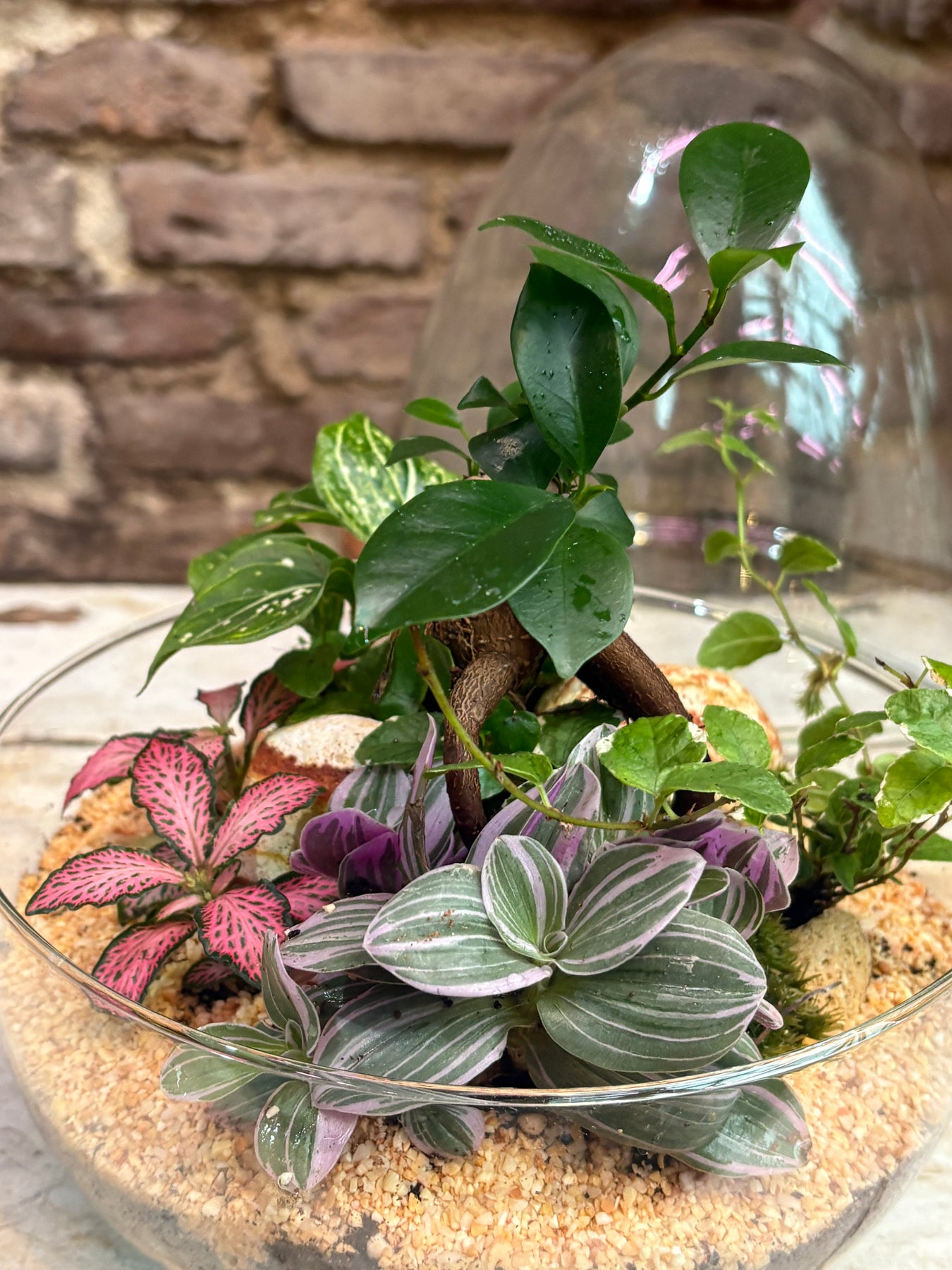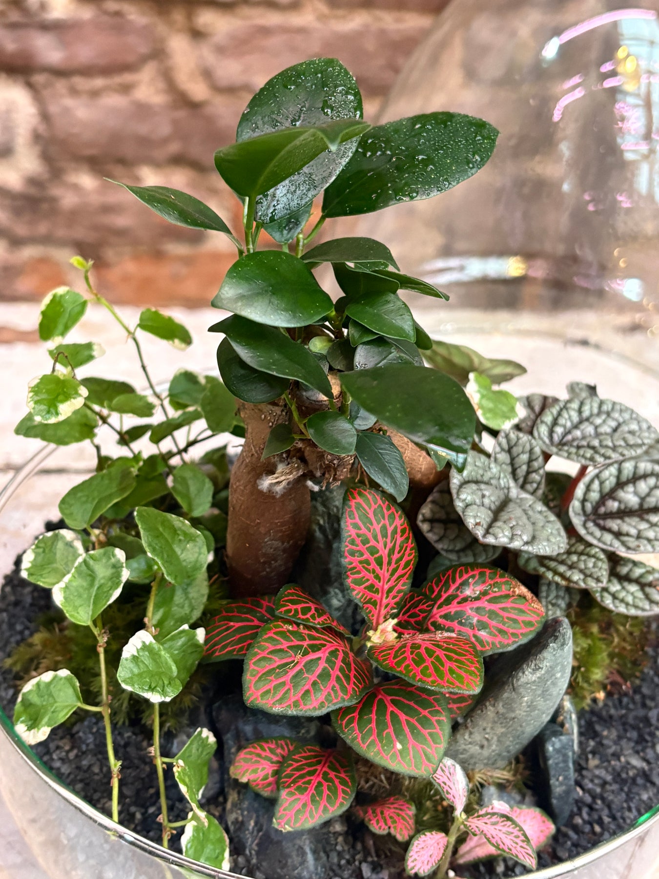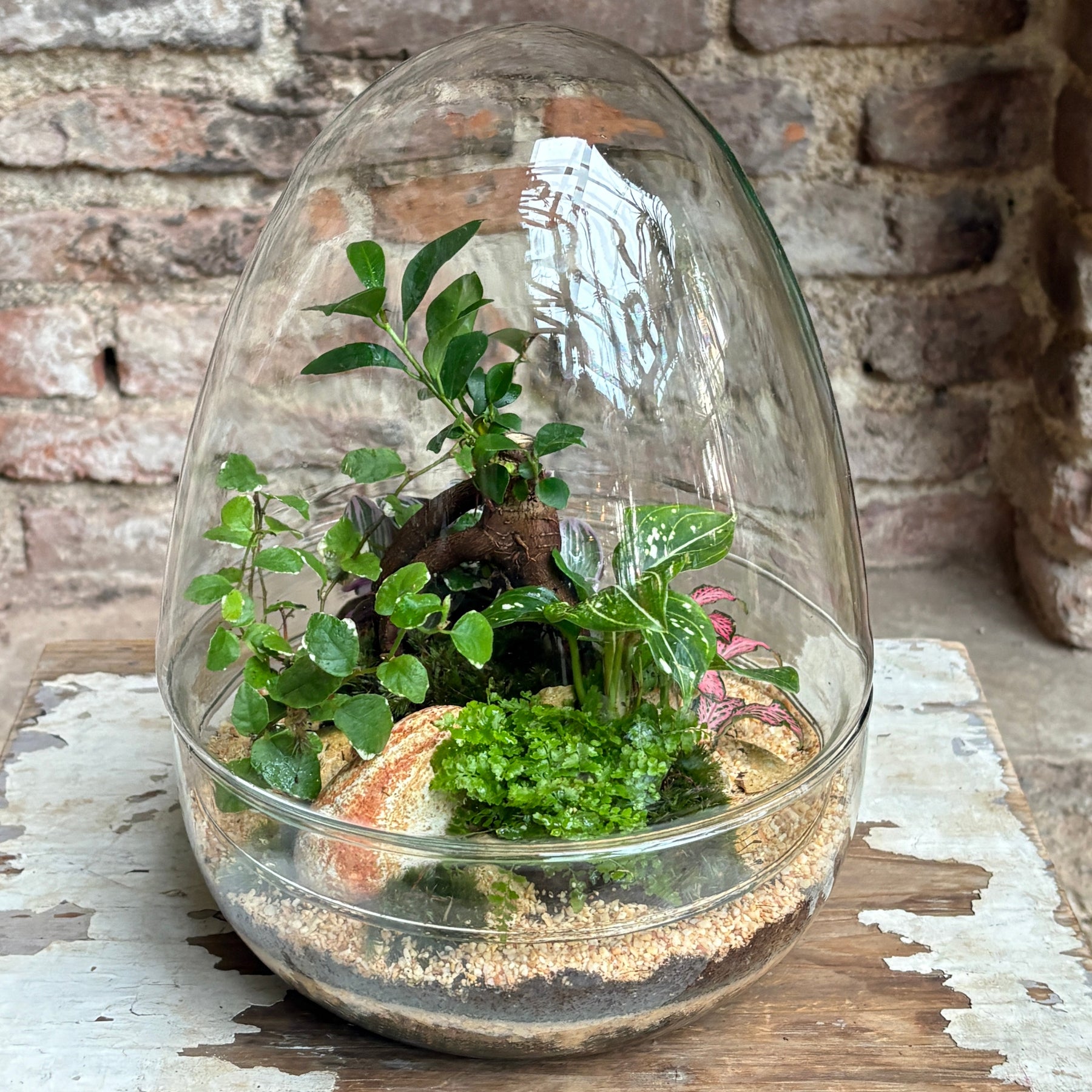 Cuidados: Coloca en luz indirecta y evita regar directamente; es necesario abrir el terrario 2 horas a la semana. La condensación en el cristal nos indica la necesidad de agua que tiene el sistema, si deja de tener condensación necesitamos pulverizar el terrario con agua destilada o embotellada, 4 o 5 pulverizaciones al suelo del terrario, esperamos y comprobamos que una vez cerrado vuelve a producir condensación. Cada 15 días girar el terrario, para evitar que las plantas terminen encarándose.