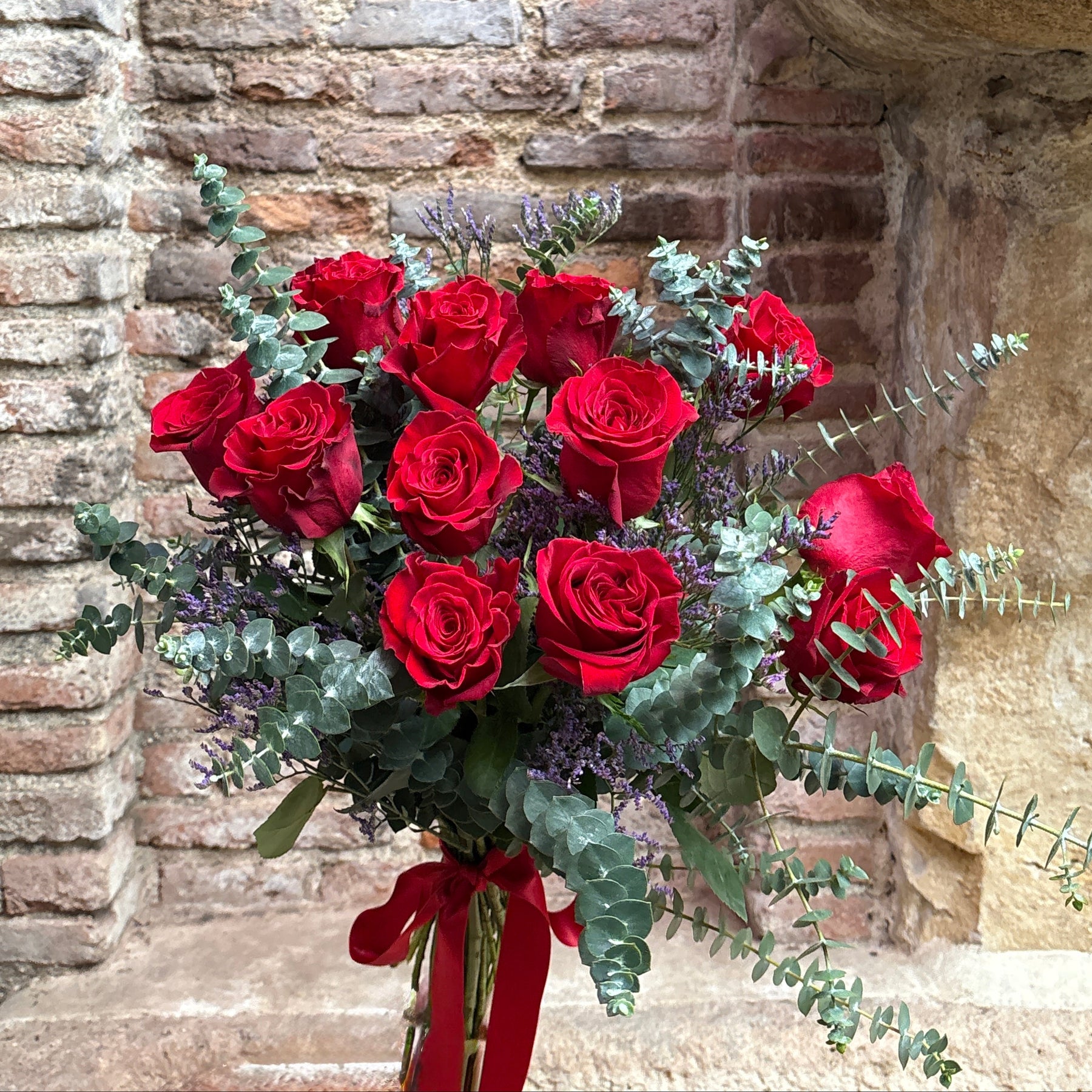 Preciosas rosas rojas en cantidades de 6, 12 o 24 unidades, con acompañamiento de limonium en lila, rosa o morado con verdes de temporada, que pueden ser eucalipto, viburnum, o lentisco. Un superventas atemporal, disponible casi siempre en nuestra tienda.