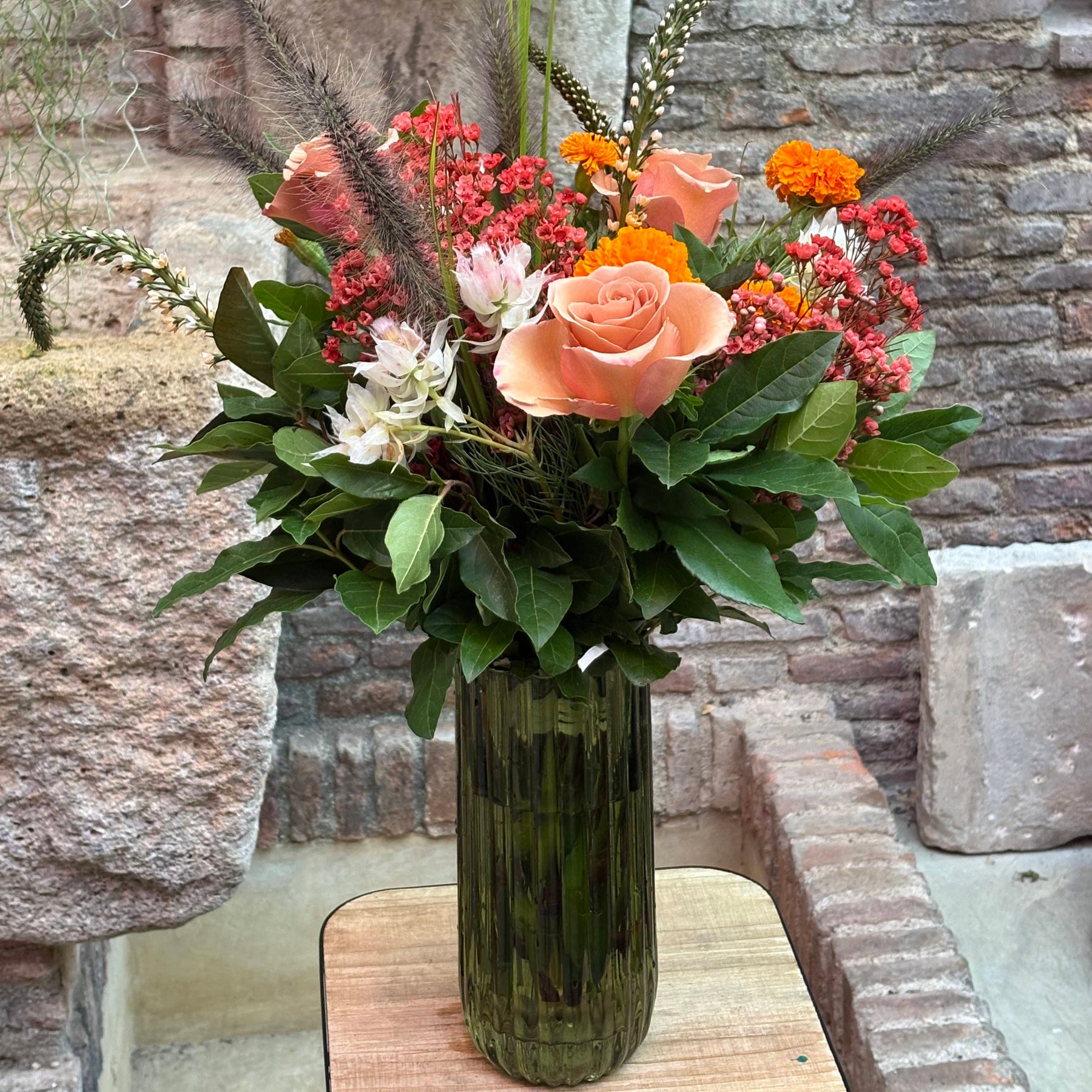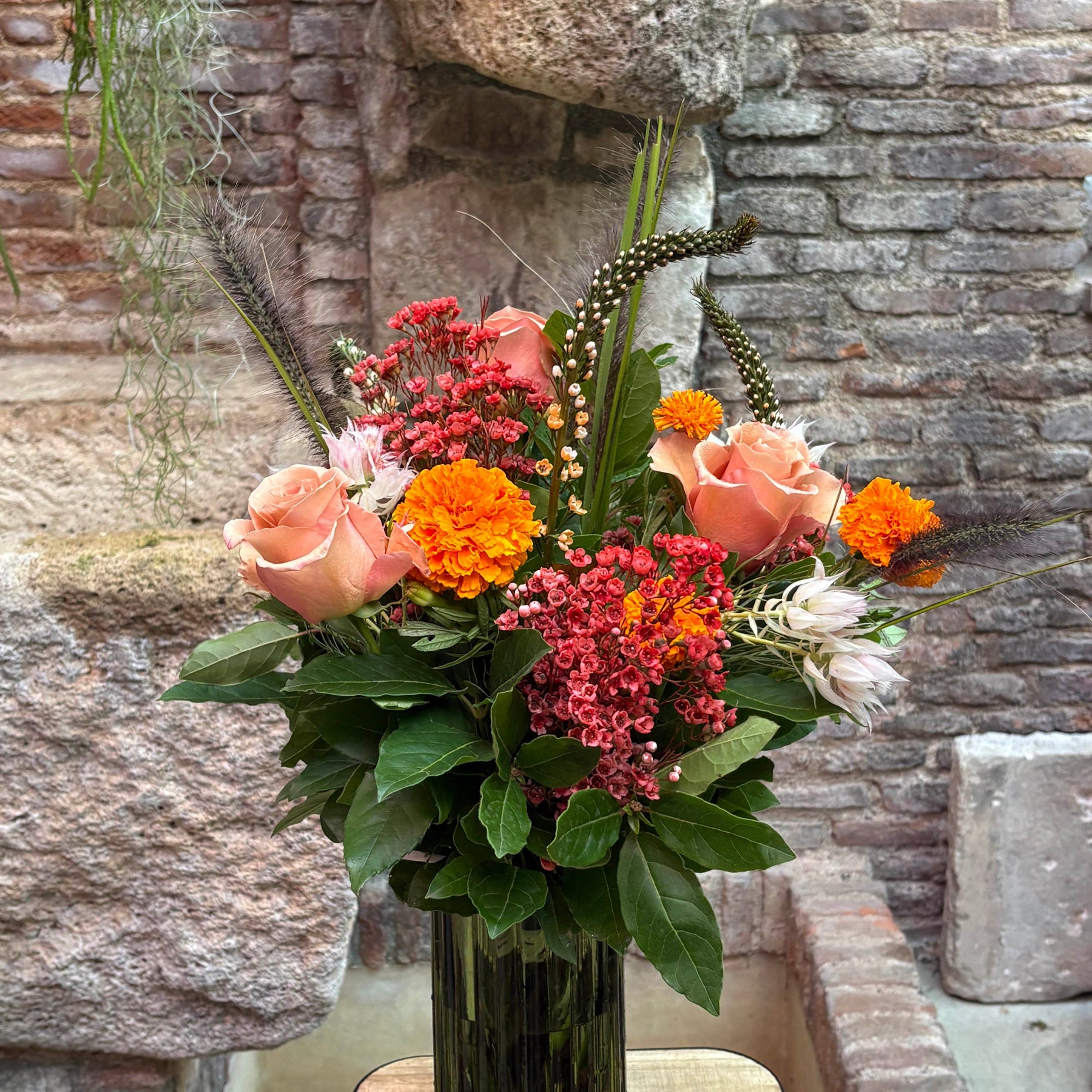 Un ramo vibrante y elegante que combina el encanto cálido de las rosas melocotón con la intensidad luminosa de los claveles de Indias en tonos naranjas. Los contrastes se realzan con pequeños detalles de flores rojas y blancas, además de espigas y follaje verde que aportan frescura y movimiento.