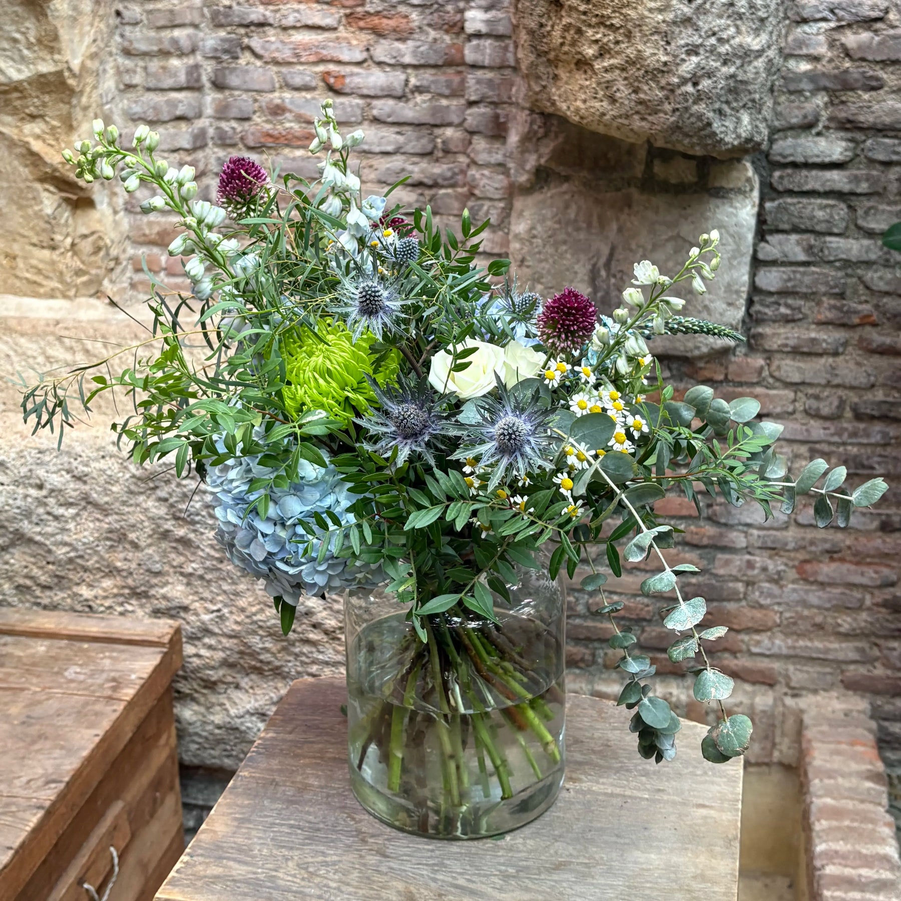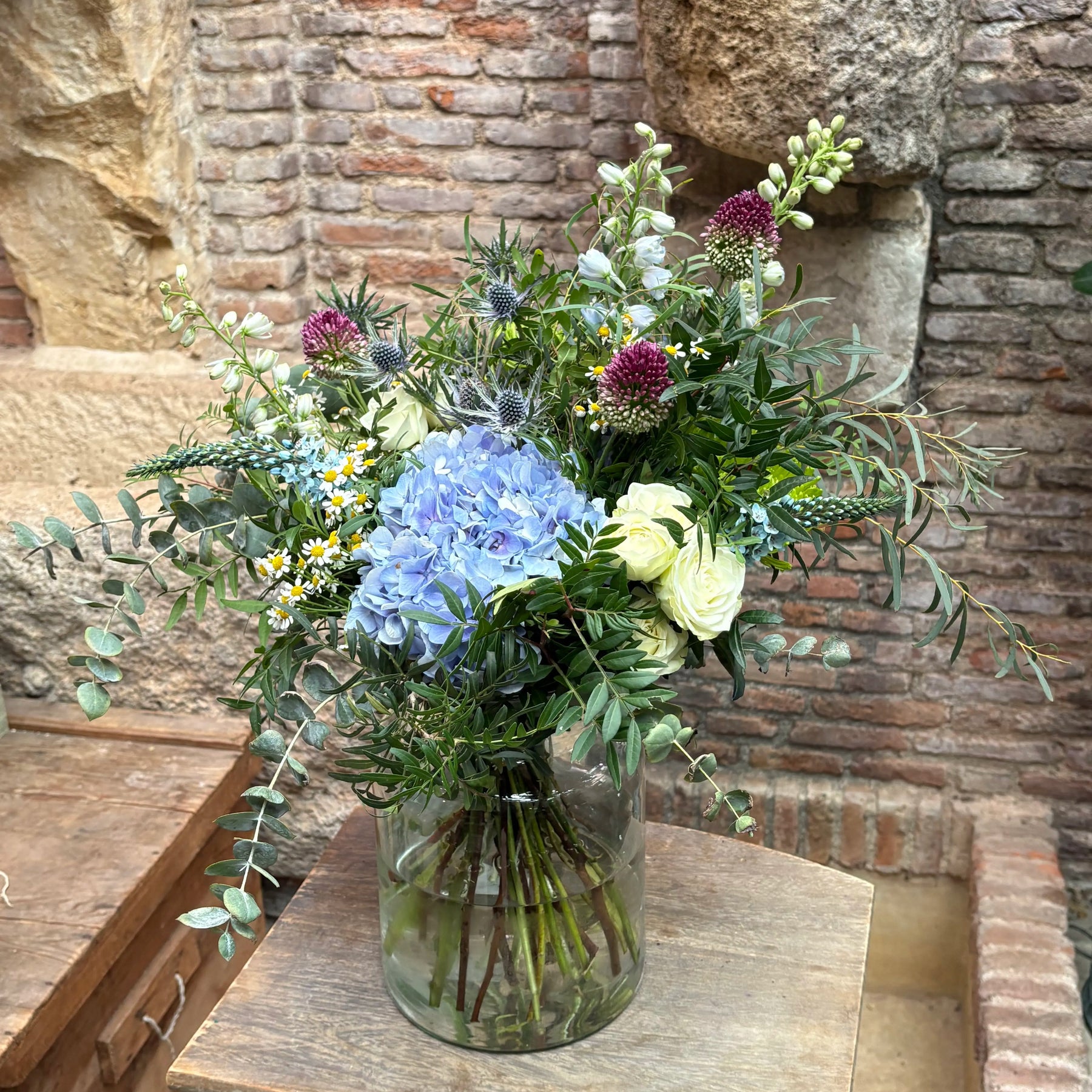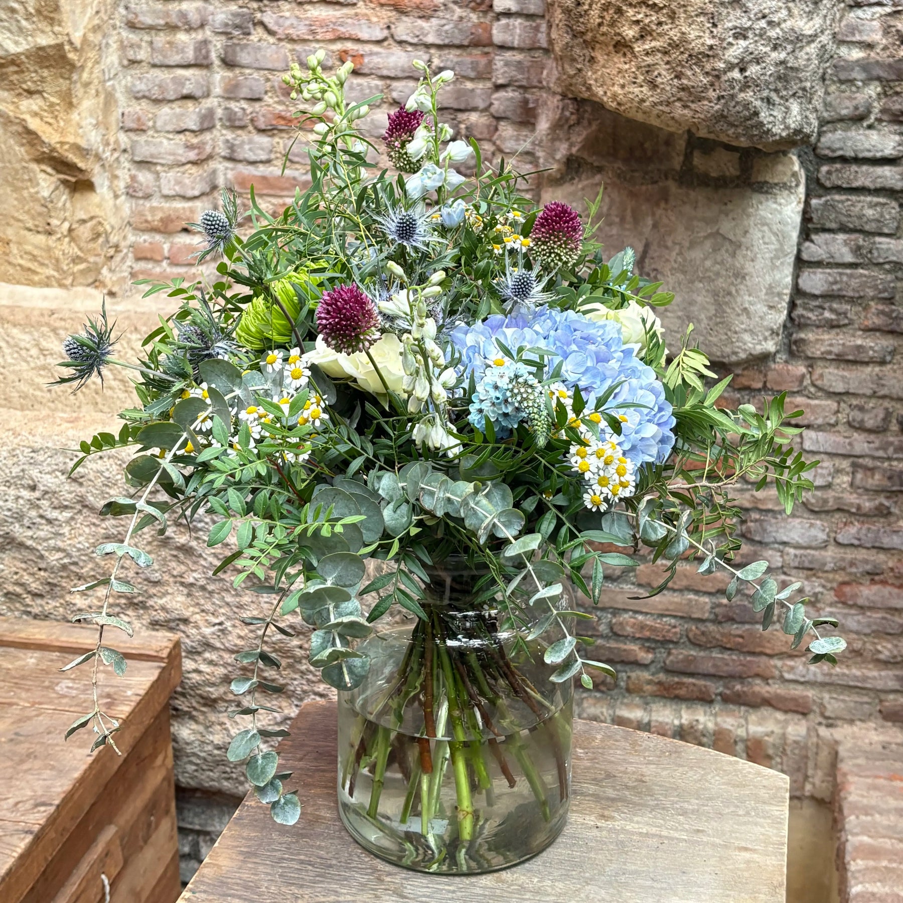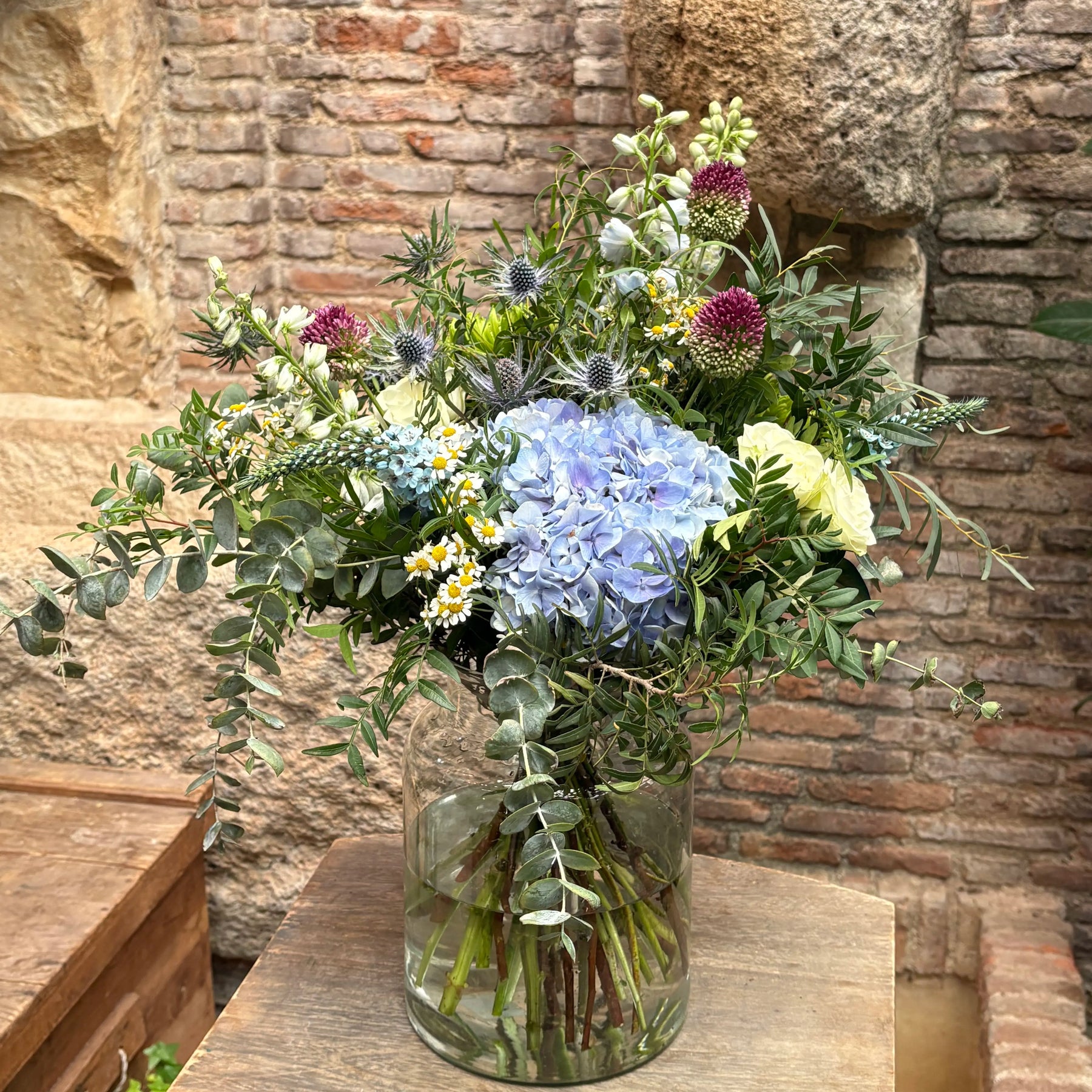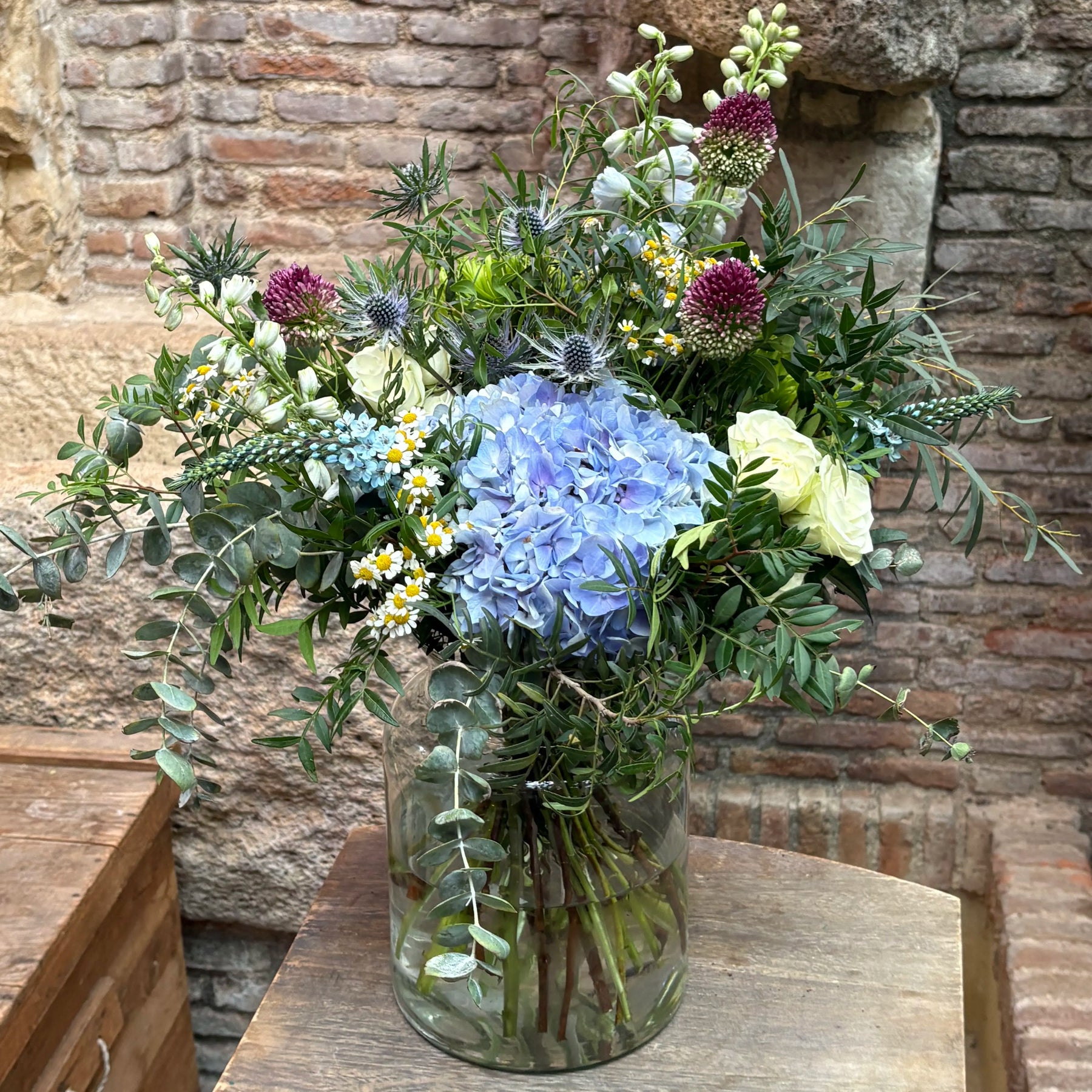 Este ramo una composición floral elegante y fresca, diseñada para transmitir armonía y belleza natural en cualquier espacio. Este bouquet combina hortensias azules, cardos azules (eryngium), botones de santolina o manzanilla, allium en tonos borgoña, flores blancas de temporada y una cuidada selección de eucalipto y follajes verdes que aportan volumen y movimiento.